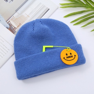 หมวกไหมพรมถักแฟชั่น รุ่นเข็มกลัด พร้อมป้ายรูปยิ้มสวยงาม (สีน้ำเงิน)