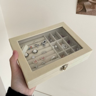 กล่องใส่เครื่องประดับ ที่เก็บเครื่องประดับหุ้มกำมะหยี่ 9 ช่อง มีช่องเก็บแหวน ต่างหู พร้อมตัวล็อค (สีครีม)