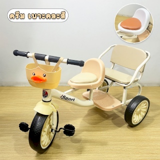 รถจักรยานสามล้อเด็ก 2 ที่นั่ง รุ่น CP-3661 มีตะกร้าหน้า พร้อมพนักพิง โครงสร้างเหล็กแข็งแรง (สีครีม-เบาะคละสี)