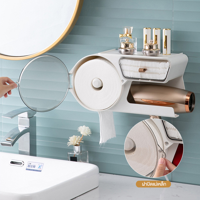 รายละเอียดสินค้า ตู้เก็บเครื่องสำอาง ทิชชู่ เอนกประสงค์ในห้องน้ำ ติดผนังไม่ต้องเจาะ คุณสมบัติ - ผลิตจากพลาสติก PP+ABS แข็งแรงทนทาน - ติดตั้งง่าย ไม่ต้องเจาะผนัง - สติ๊กเกอร์กาวนาโน แรงยึดสูง ลอกออกได้ไม่ทำลายผนัง - ไม่ต้องเจาะผนัง รับน้ำหนักได้มาก - ใช้งานได้หลากหลาย ได้ทั้งทิชชูม้วน ทิชชูแผ่น - ชั้นบนมีที่วางเครื่องสำอาง แชมพู - มีฝาปิดกันน้ำ สีสันสวยงาม - มีที่เก็บไดร์เป่าผม - ขนาดสินค้า 13.7x34x17.5 Cm - น้ำหนักสินค้า 800 กรัม